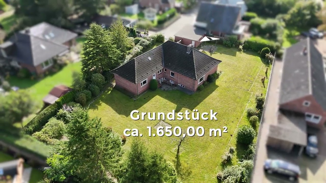 Zum Bungalow gehört eine Doppelgarage, die zum Teil auf einem separaten Flurstück errichtet wurde. Das Grundstück teilt sich somit in ein Hauptflurstück mit einer Größe von ca. 1.593 m² und einem zweiten kleineren Flurstück mit einer Größe von ca. 87 m² auf, so dass insgesamt 1.650 m² Grundstücksfläche zur Verfügung stehen.